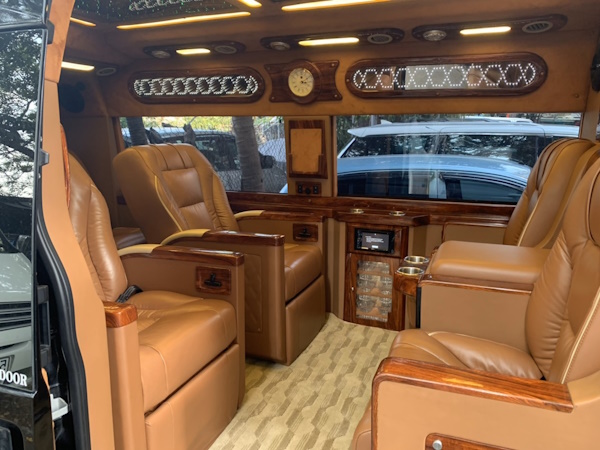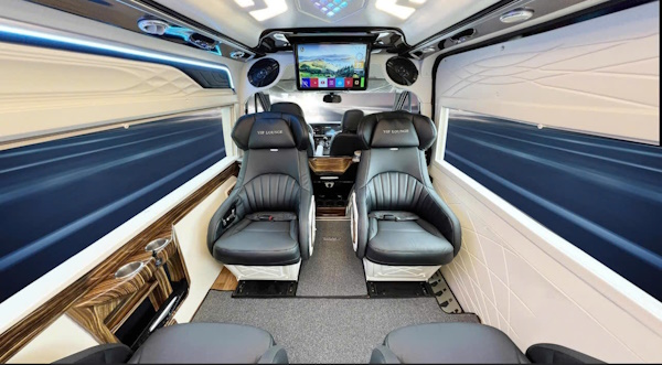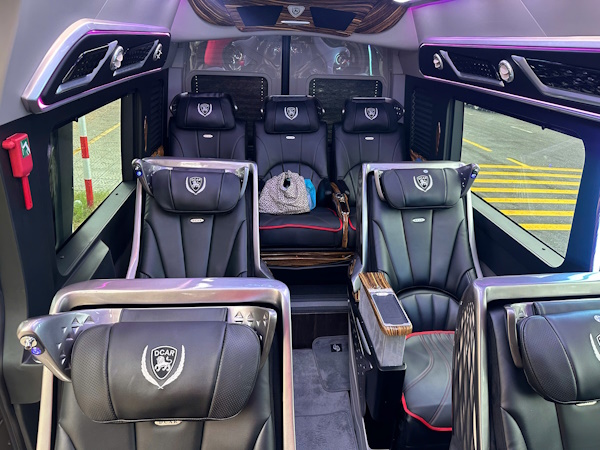 Xe Limousine 9 chỗ: Được nâng cấp từ Ford Transit hoặc Hyundai Solati với nội thất sang trọng, ghế da cao cấp có chức năng massage, TV, wifi, cổng sạc USB.